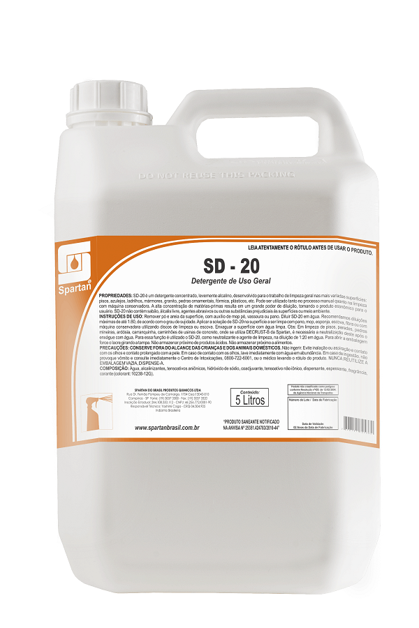 SD-20 é um detergente concentrado, levemente alcalino, desenvolvido para o trabalho de limpeza geral nas mais variadas superfícies: pisos, azulejos, ladrilhos, mármores, granito, pedras ornamentais, fórmica, plásticos, etc. Pode ser utilizado tanto no processo manual quanto na limpeza com máquina conservadora.
