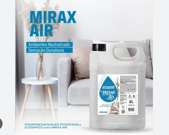 A Linha Mirax Air apresenta alta fixação e durabilidade, fazendo com que a perfumação do recinto perdure por mais tempo. Os produtos possuem em sua fórmula agentes especiais de princípios nano tecnológicos, que absorvem as moléculas causadoras do odor impedindo a sua proliferação, acabando com o mau cheiro e deixando no ar uma fragrância suave e agradável.